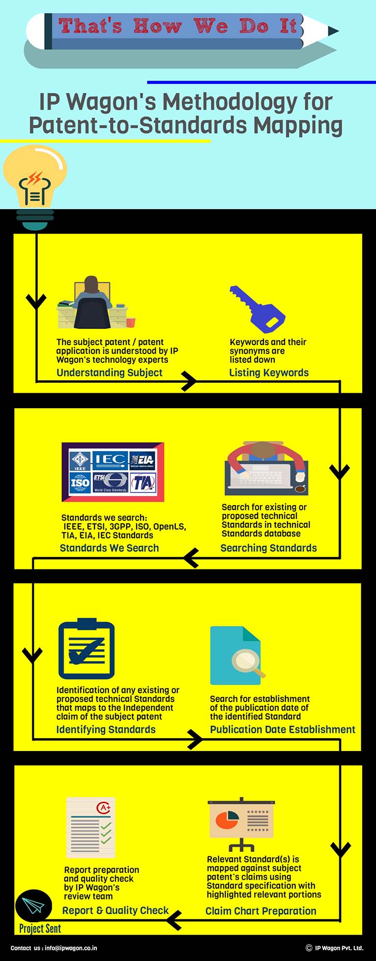 Claim charts are prepared to determine and establish the extent of overlap between one or more claims of a patent and a technology standard. These claim charts are used by Patent Attorneys to prove infringement of the standard on the patent. IP Wagon’s team has a collective experience of preparing more than 2,000 claim charts related to Electronics, Computer Sciences, Embedded Systems, Communications, and Medical devices.
